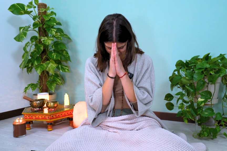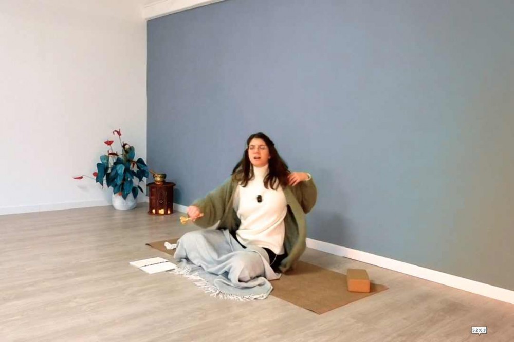 Entriamo in connessione con il nostro respiro e pratichiamo la respirazione yogica per rallentare il ritmo del nostro battito, calmare la mente e preparare il diaframma al canto del mantra OM. Pratichiamo il mantra OM per 54 volte (la metà di 108, numero ideale) e rimaniamo in meditazione per osservarne gli effetti.